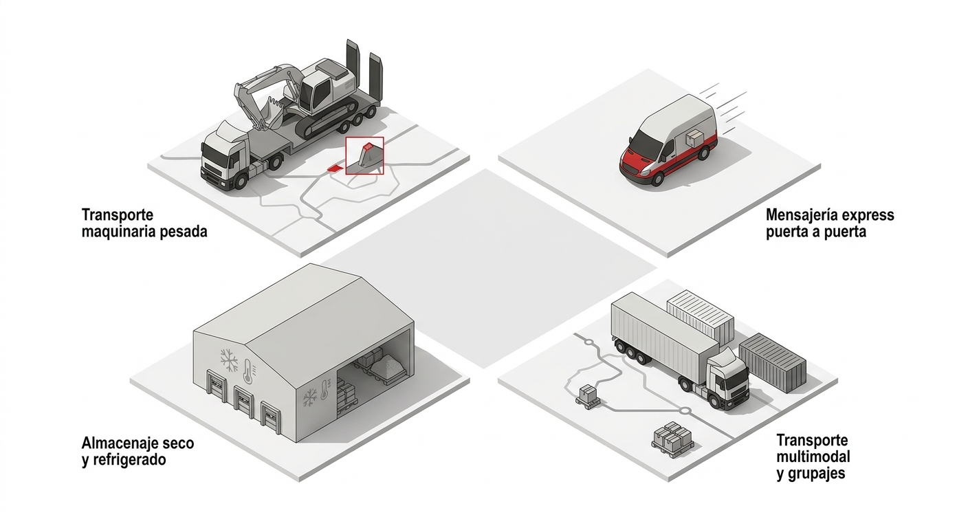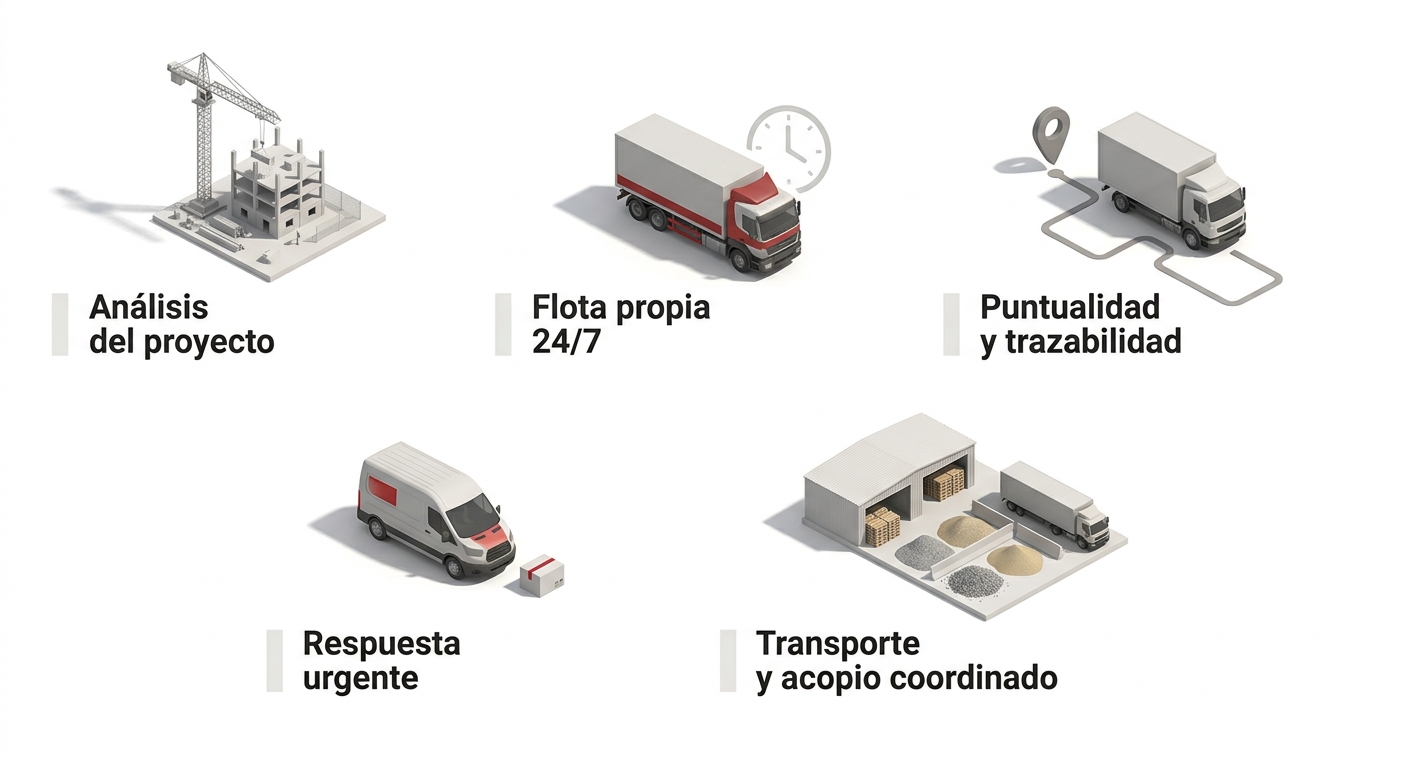 Habitualmente se combinan transporte especial para maquinaria, transporte dedicado o de graneles, mensajería urgente para suministros críticos y almacenaje logístico para gestionar picos de material. En proyectos que utilizan distintos tipos de áridos, hormigón o materiales a granel, contar con flota adaptada y coordinación directa con obra evita paradas y sobrecostes por retrasos.