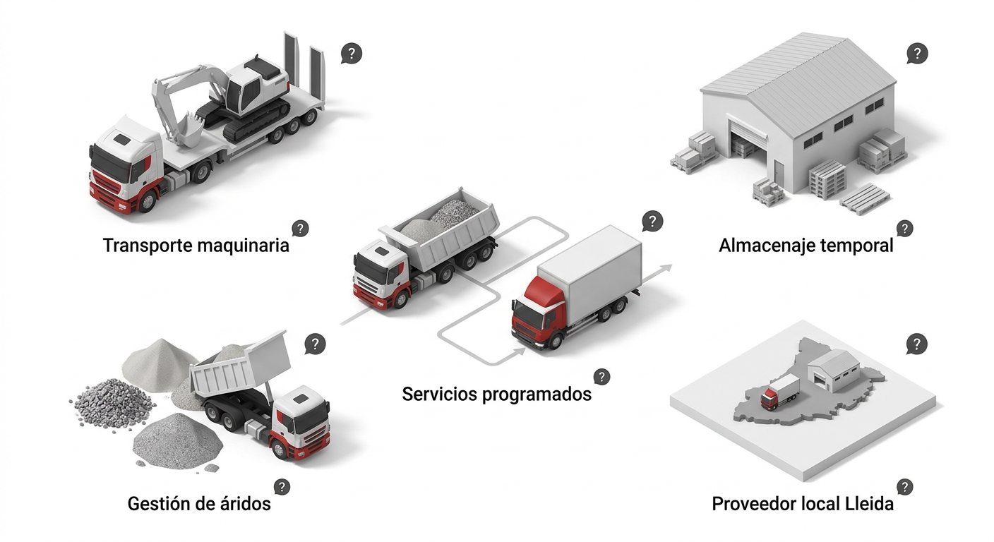 Una obra eficiente depende de una logística bien planificada. En Lleida, existen proveedores especializados que cubren las necesidades habituales del sector de la construcción, desde el transporte de maquinaria hasta el almacenaje temporal de materiales. Contar con estos servicios reduce tiempos muertos, evita sobrecostes y mejora la coordinación en obra.